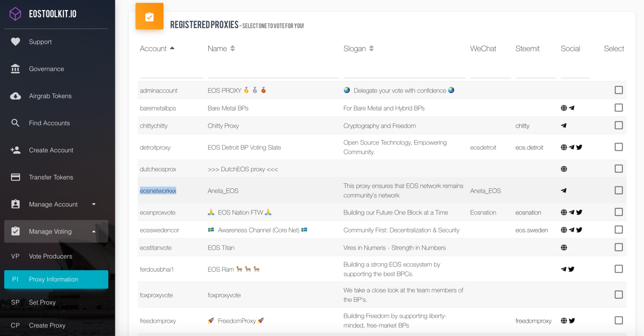 In collaboration with Aloha EOS we have added a Proxy Information Table to allow proxies to register their accounts with background information that automatically is stored on the Aloha EOS smart contract. You can select your favourite proxy from the table and assign your vote to them directly from the toolkit.